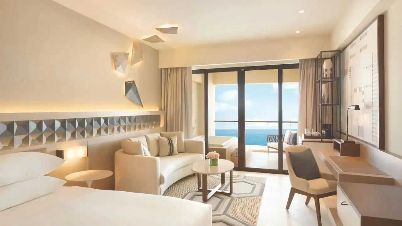 Enjoy stunning ocean views from amid nearly 700 sq ft within Hyatt Ziva Cancun's Turquoize suites, the new adult-only (18+), all beachfront tower featuring a balcony with private hot tub and seating section.
