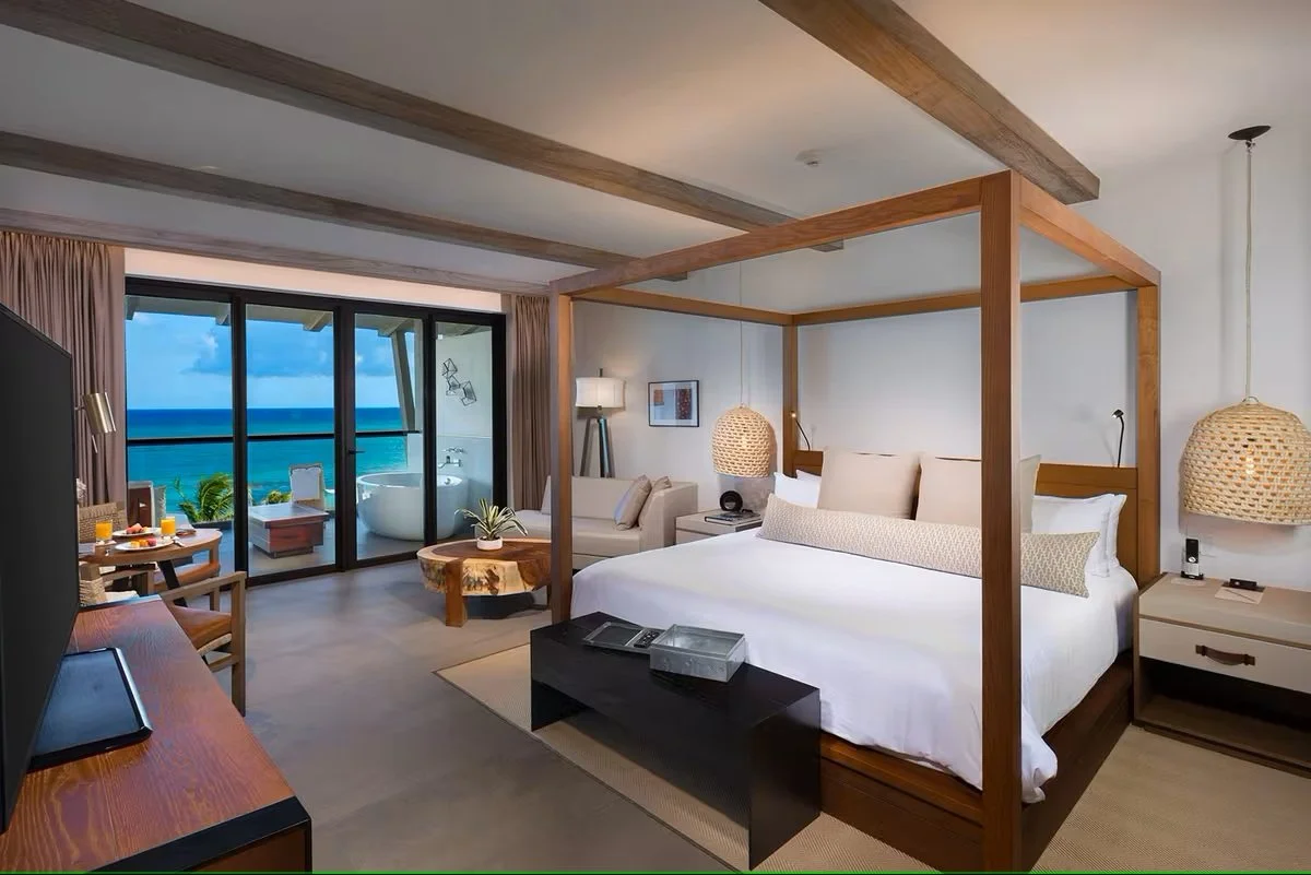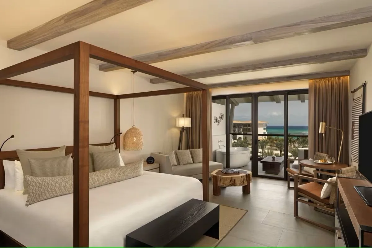 The spacious Alcoba Ocean View offers views of the ocean, an exterior hydro spa tub and exterior lounging area where you can relax and enjoy the stunning panorama.